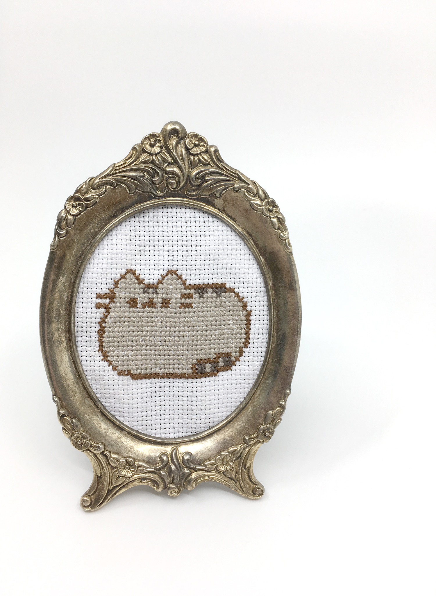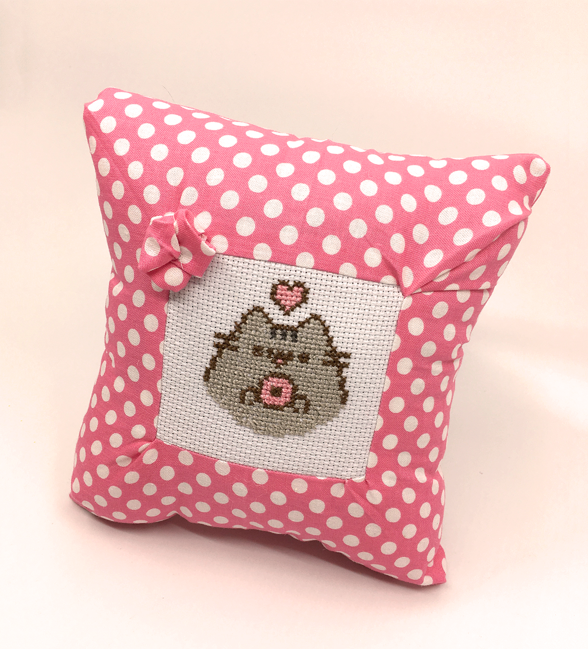 So, I finished one of my Pusheen cross-stitch squares, and decided to turn it into a mini-pillow. It isn’t perfect, but I think it still is pretty cute! Yay for Pusheen!